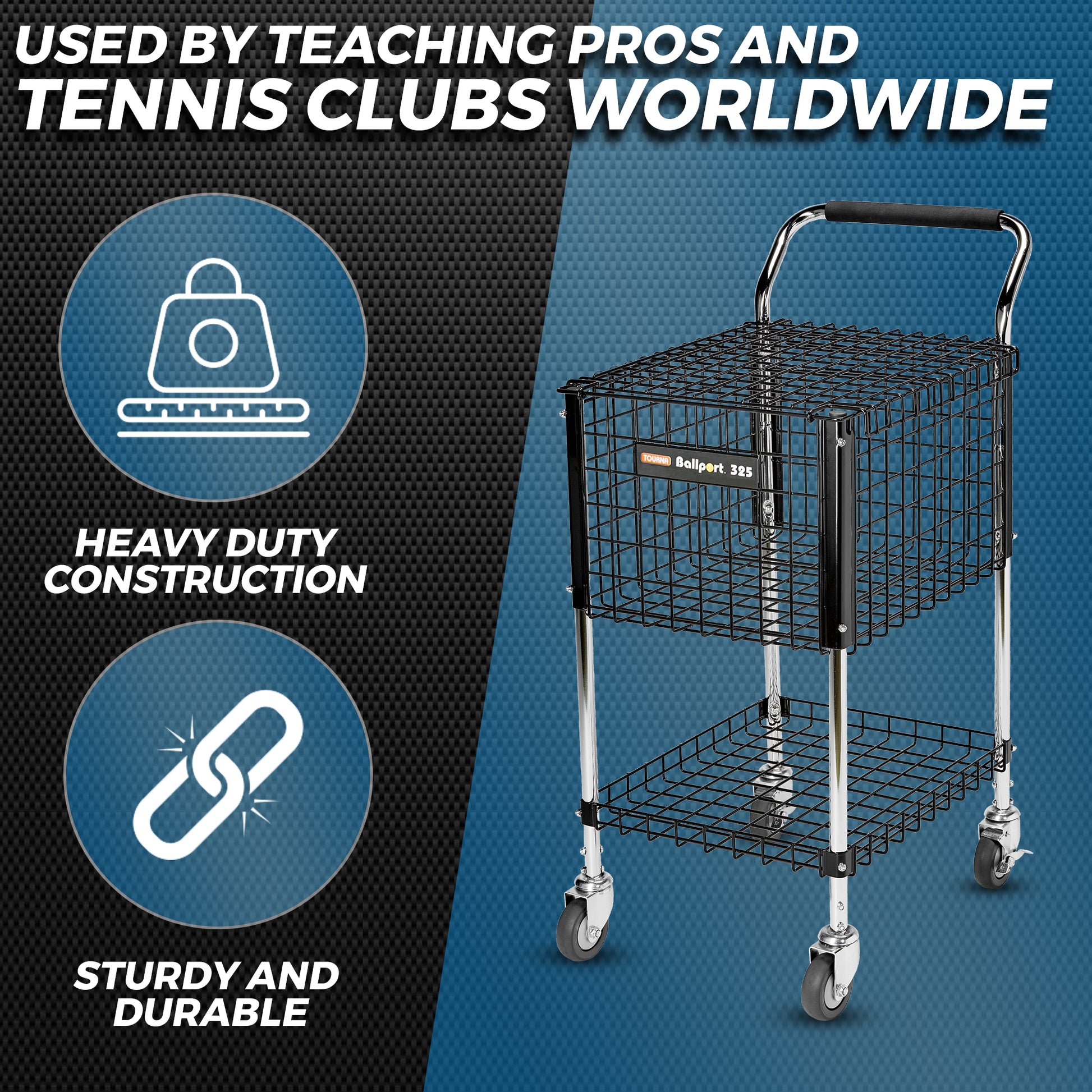 - High capacity tennis teaching cart holds 325 balls. Perfect for serious tennis practice.