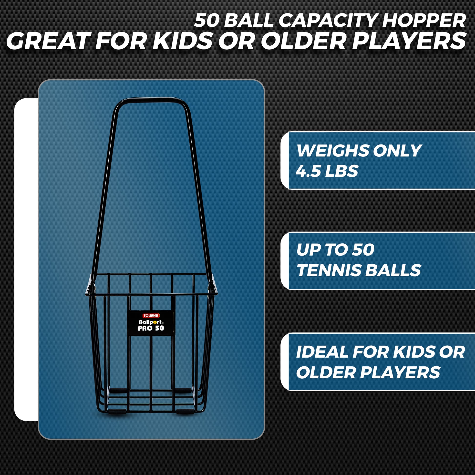 - Holds up to 50 regular tennis balls and weighs only 4. 5 lbs